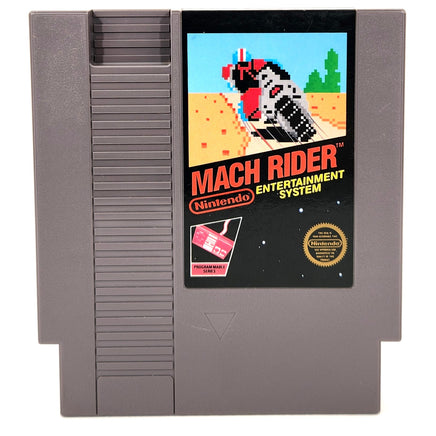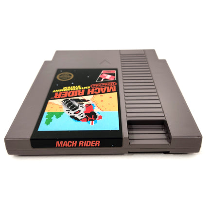 Set in the year 2112, Mach Rider for the NES plunges players into a post-apocalyptic Earth overrun by hostile invaders. As the titular Mach Rider, you navigate treacherous highways on a high-speed, weaponized motorcycle, combating enemy vehicles known as Quadrunners. The game combines intense vehicular combat with strategic gear-shifting mechanics, offering a unique blend of action and racing in a desolate, futuristic landscape.