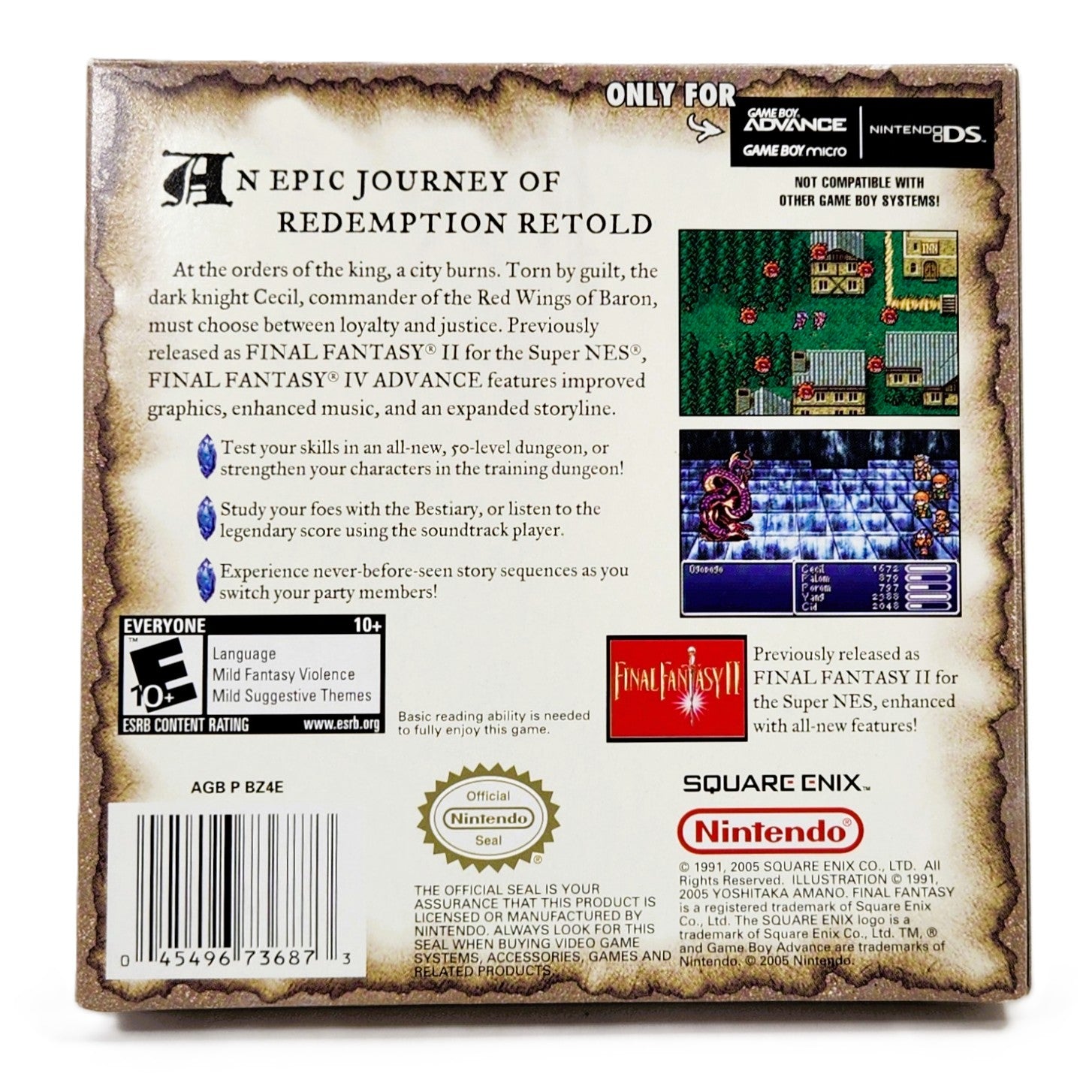 The saga of Cecil, Kain, Rosa, and Rydia finds new life on the Game Boy Advance in Final Fantasy IV Advance. After a brutal mission for the Kingdom of Baron, dark knight Cecil questions his orders and is stripped of command of the Red Wings. A conspiracy surrounding the elemental Crystals and the sorcerer Golbez sets a sweeping journey into motion, from the deserts of Damcyan to the towered skies of Babil and the moonlit ruins beyond.