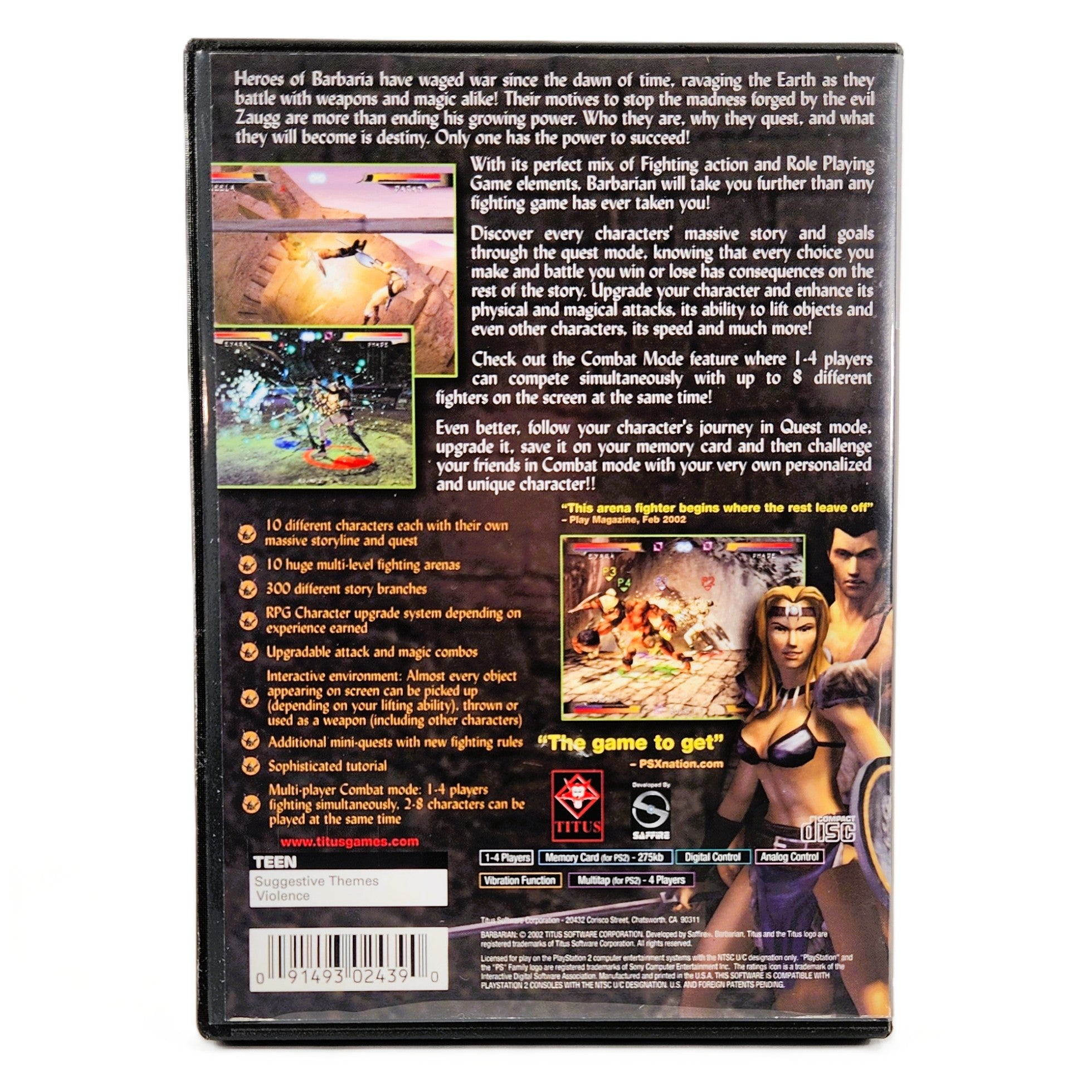 Designed by Saffire and published by Titus, the game aimed to deliver a visceral alternative to traditional fighting games of the era, with its over-the-top finishing moves and destructible arenas. While it didn’t achieve the critical acclaim of bigger names on PS2, Barbarian has developed a cult following among collectors who appreciate its raw, unpolished style and unique place in the early 2000s console library.