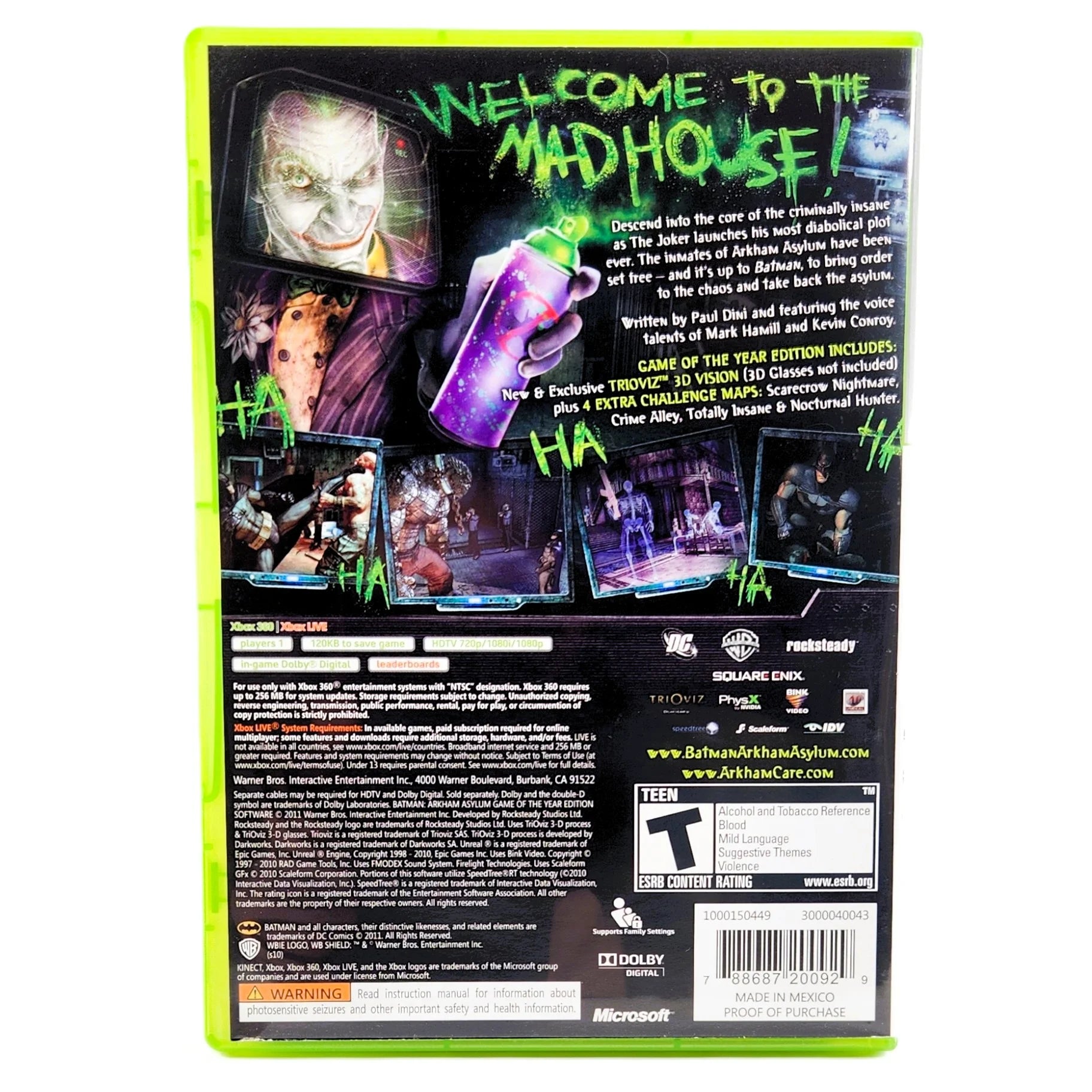 - Notes: Batman: Arkham Asylum for Xbox 360 includes the original artwork and manual, housed in a brand-new aftermarket replacement case; disc is clean, scratch-free, and fully tested. A solid copy of a genre-defining Batman title that’s ready to enjoy or display.