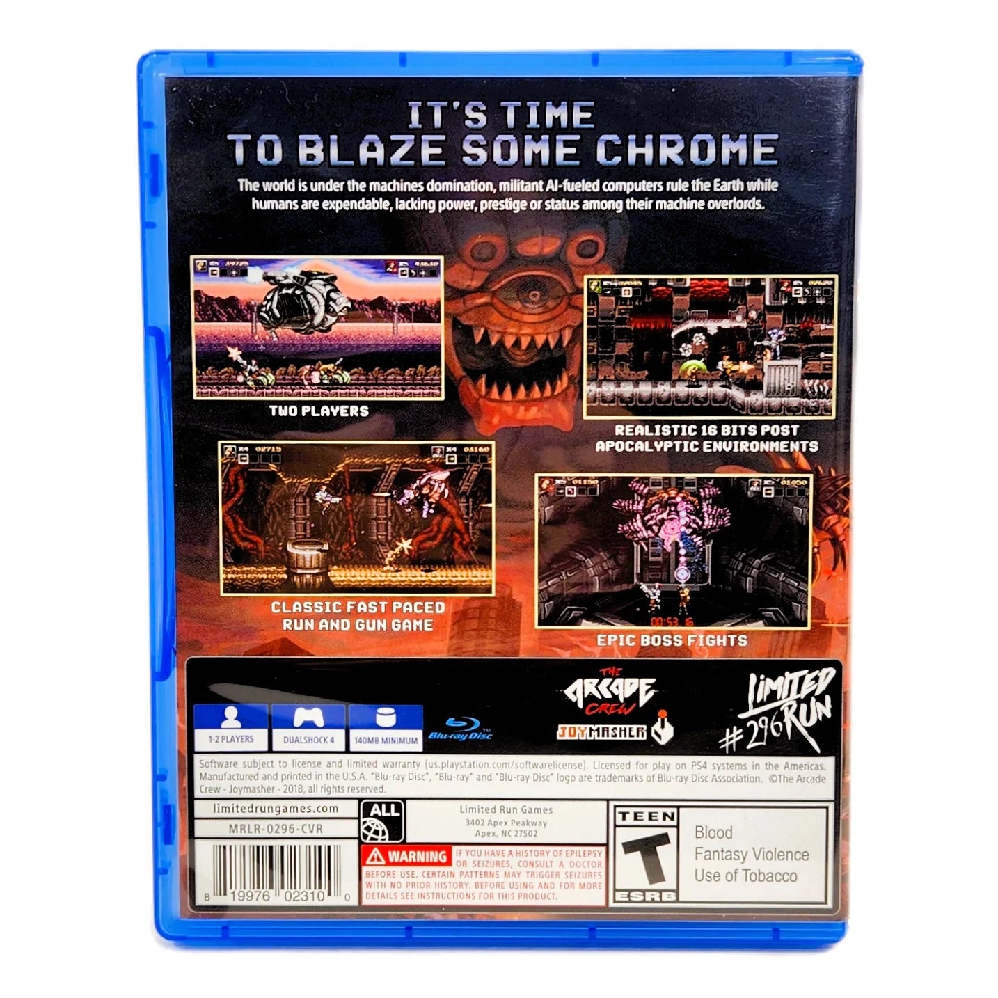As a run & gun game for PlayStation 4, it proudly channels the blistering intensity of Contra and other 16-bit arcade-era shooters, capturing that same relentless pacing and tight control feel. Weapon pickups instantly reshape your firepower, encouraging aggressive pushes through screen-filling enemy formations and towering mechanized bosses. Released in 2019 through Limited Run Games, this PS4 disc stands as a modern 16-bit cartridge-era revival — a must-play for retro action fans who miss the uncompromising edge of classic run & gun greatness.