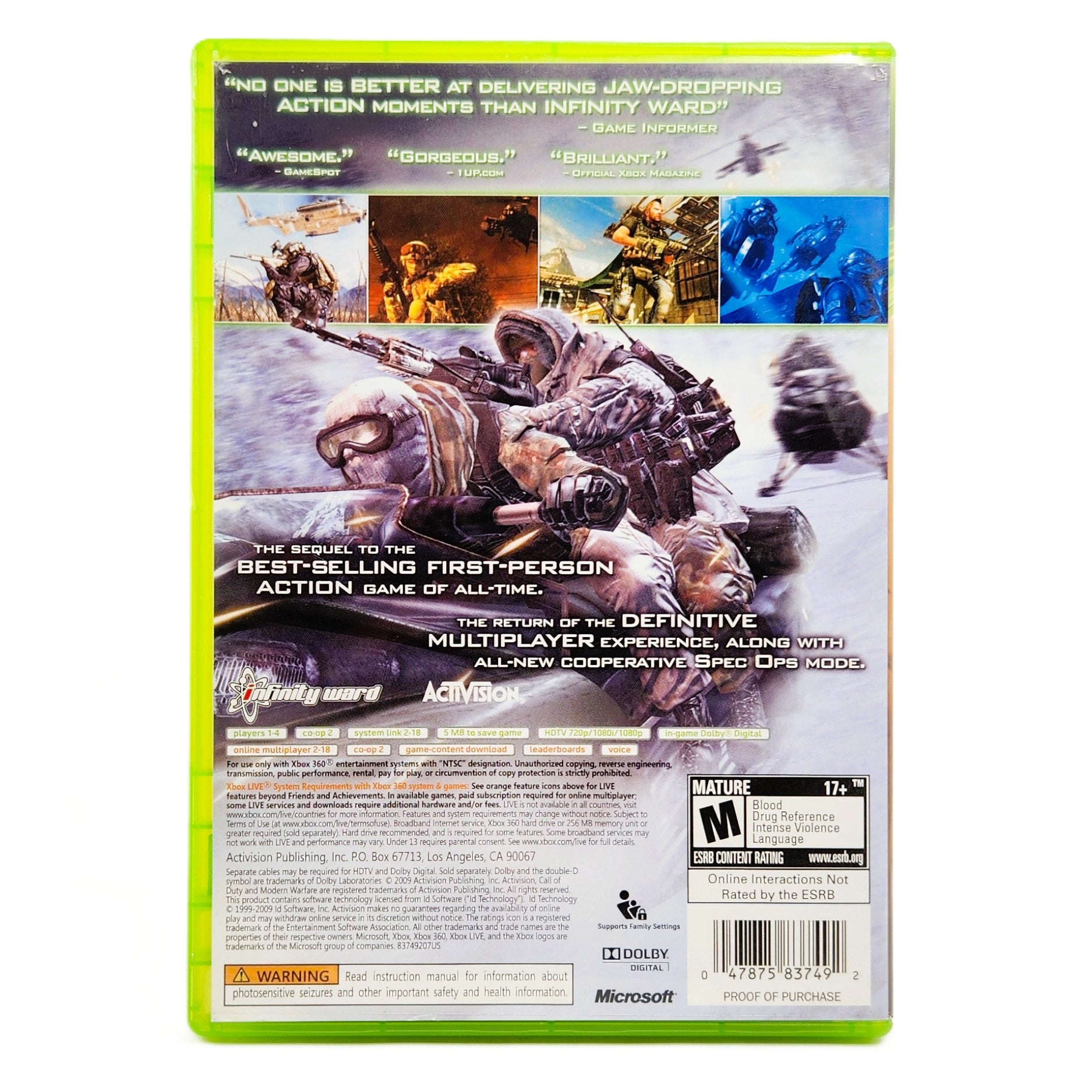 - Notes: Modern Warfare 2 for Xbox 360 in its official case with manual and artwork included; disc is clean and scratch-free. Ready to play or collect.