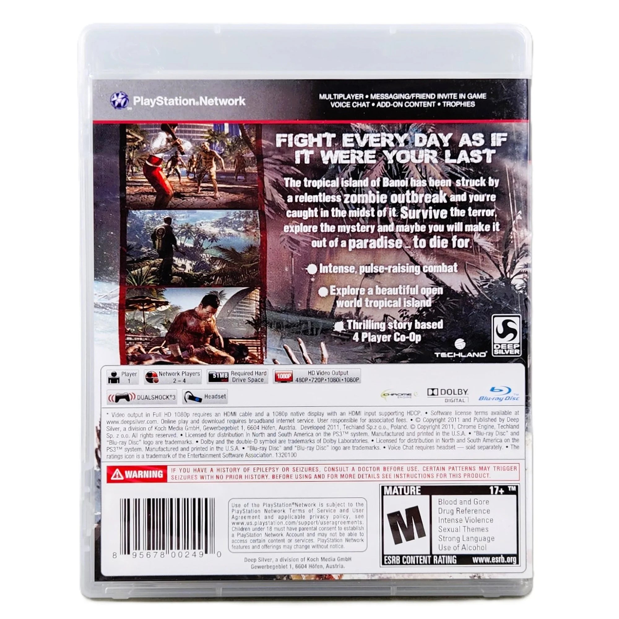 - Notes: Authentic Dead Island for PlayStation 3 in its original OEM case with manual and artwork included; disc is clean and fully tested. The cover art remains sharp and well-presented, making this a nice addition to any PS3 collection.