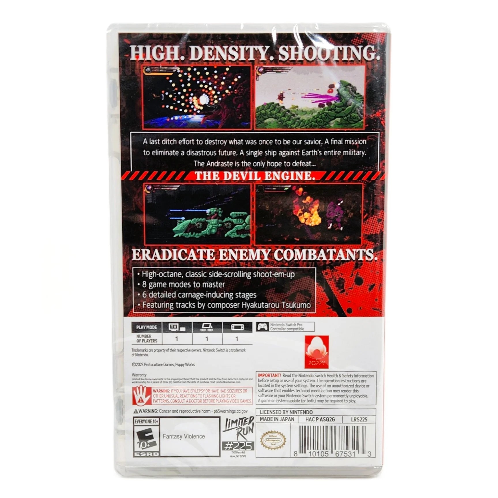 A relentless storm of lasers, explosions, and high-speed aerial combat defines Devil Engine: Complete Edition [Limited Run #225], an electrifying side-scrolling space assault built for the Nintendo Switch console. Waves of mechanized enemies flood the screen as towering warships unleash dense projectile patterns that demand constant movement and split-second precision. Piloting the experimental fighter Andraste, players weave through chaotic bullet storms while unleashing devastating weapon barrages, creating a tense rhythm of survival and counterattack that rewards sharp reflexes and disciplined control.