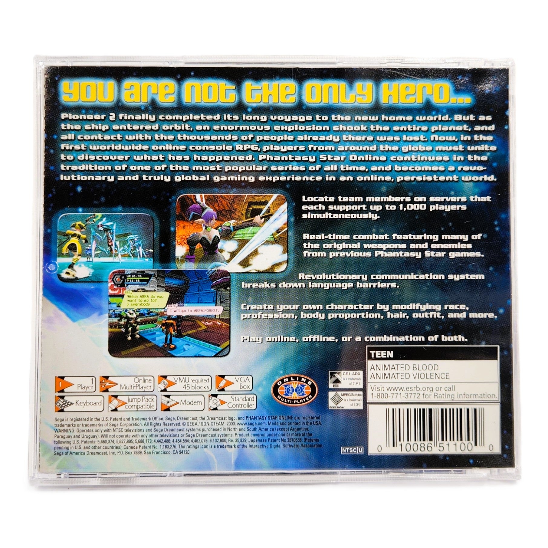 - Notes: Dreamcast jewel case remains in excellent condition with only minimal shelf wear visible. The rear tray artwork insert looks very good, retaining strong color and a clean overall presentation. Instruction manual is near mint—no writing, no wrinkles, and staples perfectly intact—making it a standout inclusion for collectors. Both included discs, the authentic Phantasy Star Online game disc and the Sonic Adventure 2: The Trial demo disc, are mint, flawless, and completely scratch-free, tested for dependable performance. A genuine Dreamcast release that’s collector-grade, display-worthy, and ready to enjoy in any curated collection.