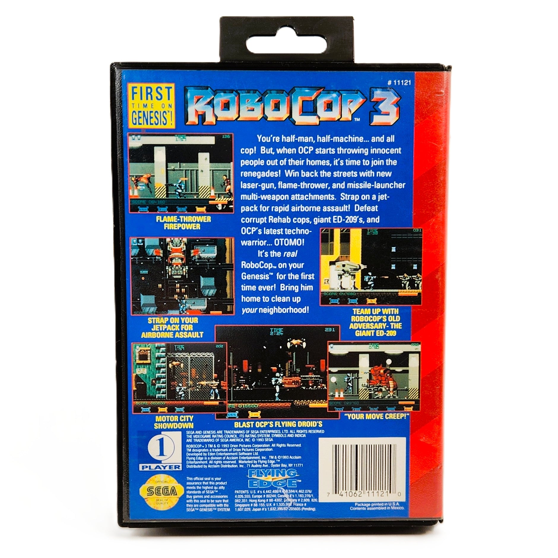 RoboCop 3 for the Sega Genesis puts players in the metallic boots of Officer Alex Murphy — the cybernetic law enforcer rebuilt to uphold justice in a collapsing future Detroit. Released in 1993 and developed by Eden Entertainment Software for publisher Flying Edge, this action-adventure adaptation draws inspiration from the feature film while forging its own identity through intense side-scrolling firefights and cinematic cutscenes. As RoboCop, players take the fight directly to the corrupt OCP Corporation and its mechanized enforcers in a desperate battle to save Delta City.