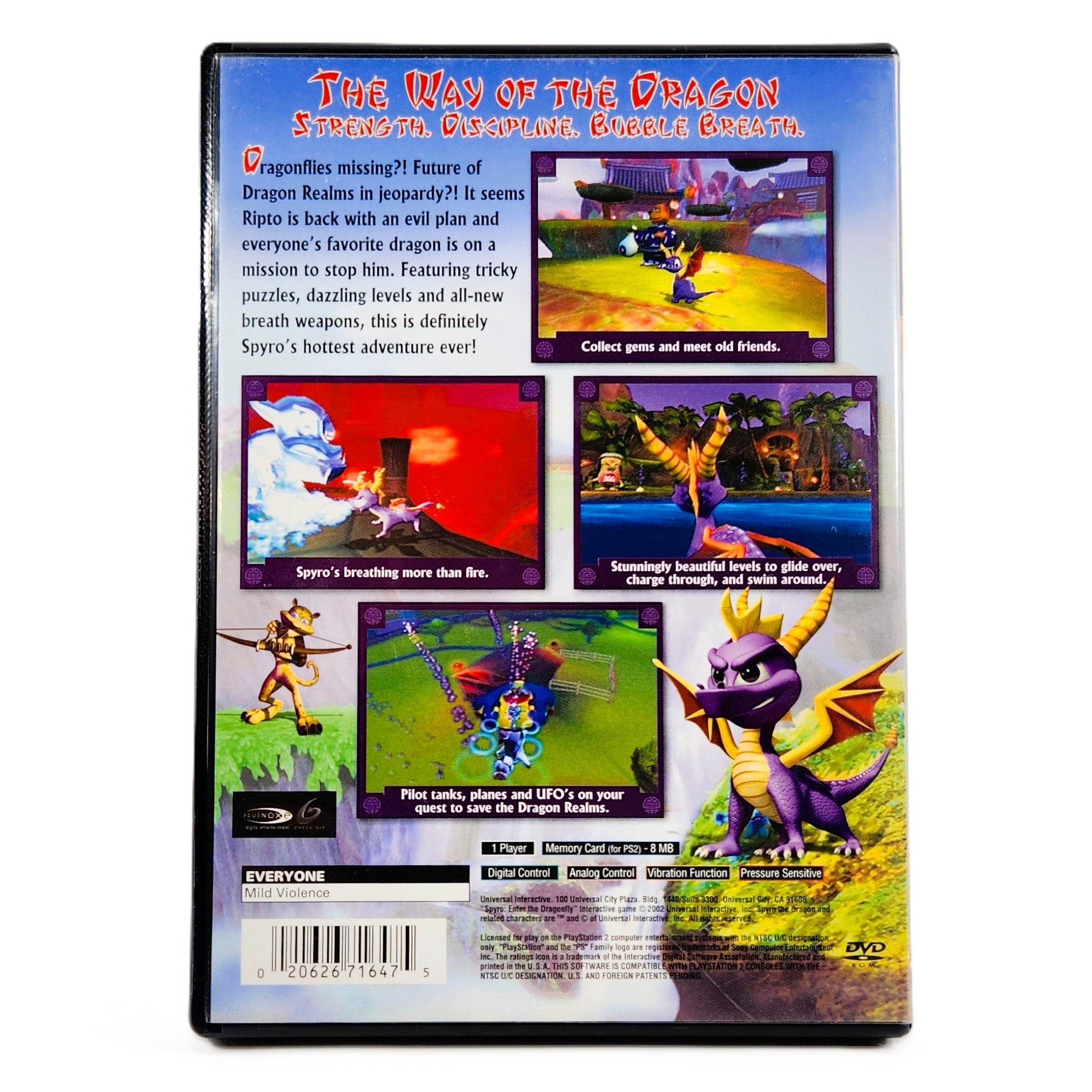 Spyro: Enter the Dragonfly brings the beloved purple dragon to the PlayStation 2 for his first adventure on sixth-generation hardware. Released in 2002 by Universal Interactive and developed by Equinoxe Digital Entertainment and Check Six Studios, the game continues Spyro’s classic quest to save the Dragon Realms after an evil spell scatters the magical dragonflies across the land. With his loyal companion Sparx by his side, Spyro must glide, charge, and breathe fire to restore balance to his world.