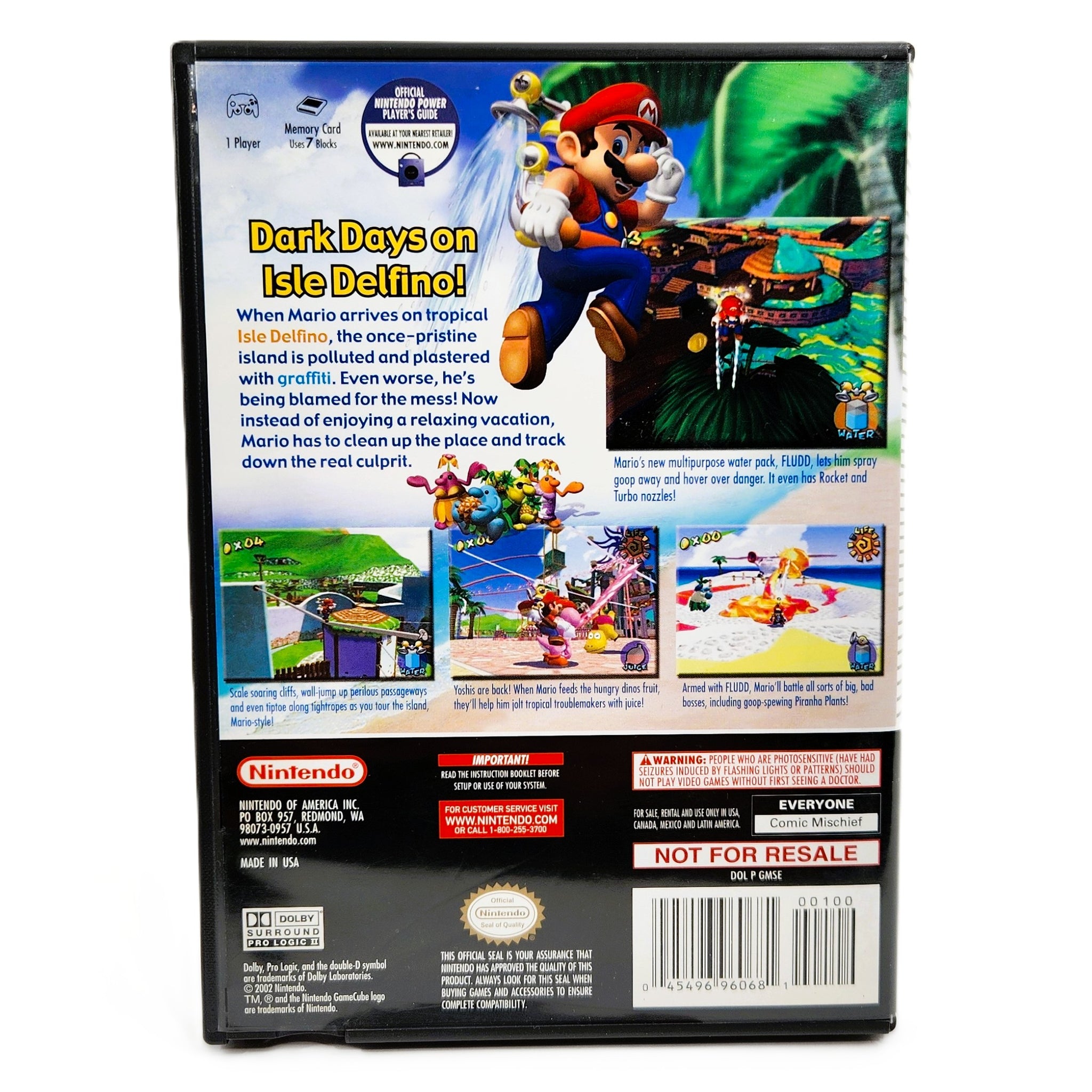 Super Mario Sunshine [Not For Resale] brought a burst of color and innovation to the Nintendo GameCube, taking the Mario franchise into dazzling new territory. Developed by Nintendo EAD under the direction of Shigeru Miyamoto and Yoshiaki Koizumi, this tropical 3D platformer sends Mario to the sunny Isle Delfino — only to find the paradise in chaos after being framed for spreading graffiti across the island. Armed with the versatile F.L.U.D.D. (Flash Liquidizer Ultra Dousing Device), Mario must clean the island, restore peace, and unmask the true culprit behind the mysterious mess.