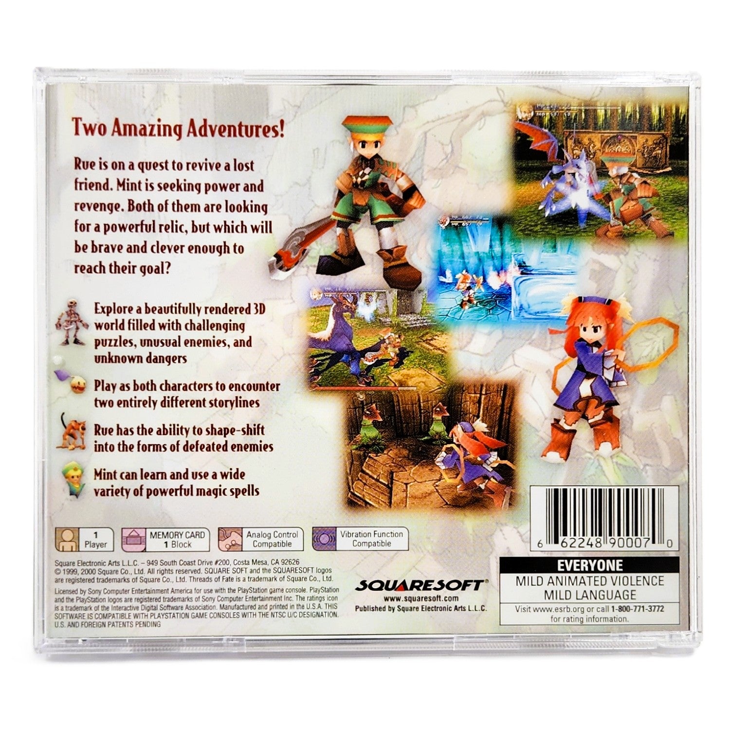 Threads of Fate is a whimsical yet deeply heartfelt action RPG from Squaresoft, released for the PlayStation 1 in 2000. Combining rich storytelling, fast-paced gameplay, and colorful 3D visuals, this hidden gem offers two intertwining adventures set in a beautifully realized fantasy world. Players can experience the story from two distinct perspectives: Rue, a stoic warrior on a quest to resurrect a lost friend, or Mint, a mischievous princess seeking ultimate power and revenge. Their journeys cross and diverge in ways that reveal a single narrative woven with humor, heart, and unforgettable charm.