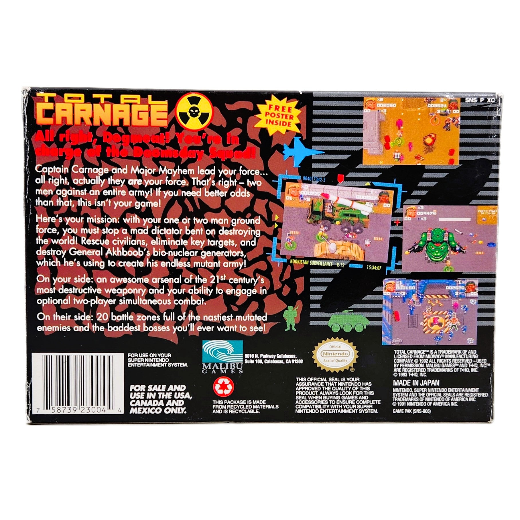 Total Carnage explodes onto the Super Nintendo Entertainment System with nonstop chaos, wild humor, and pure arcade mayhem. Developed by Black Pearl Software and published by Malibu Games in 1993, this over-the-top run ’n gun shooter puts you in the boots of commandos Captain Carnage and Major Mayhem as they blast their way through an outrageous war zone filled with explosions, mutants, and maniacal enemies. Inspired by the hit arcade game from the creators of Smash T.V., Total Carnage delivers adrenaline-fueled action that never lets up.